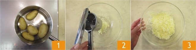 Pour préparer les boulettes de légumes, commencez par mettre sur le feu une casserole avec beaucoup d'eau froide salée et plongez-y les pommes de terre après les avoir soigneusement lavées 1. Faites-les cuire pendant 30-40 minutes, puis épluchez-les encore chaudes, écrasez-les avec un presse-purée 2, en recueillant la purée dans un grand bol 3.