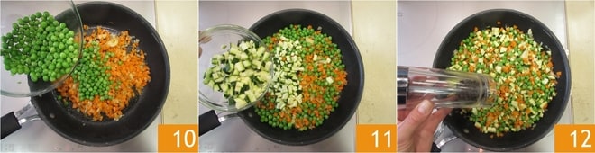 Laissez cuire pendant quelques minutes, puis ajoutez les carottes et après encore une minute les petits pois 11. Enfin, ajoutez les courgettes 11, salez, poivrez 12.