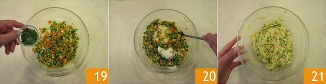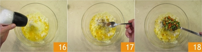 Faites cuire pendant environ 10 minutes, en veillant à ce que les légumes restent légèrement croquants 13. Mélangez bien et laissez tiédir. Prenez maintenant le bol avec les pommes de terre écrasées et ajoutez : le fromage râpé 14 et l'œuf légèrement battu 15.