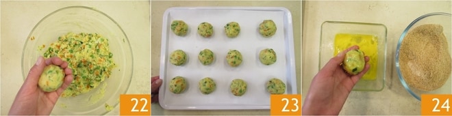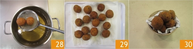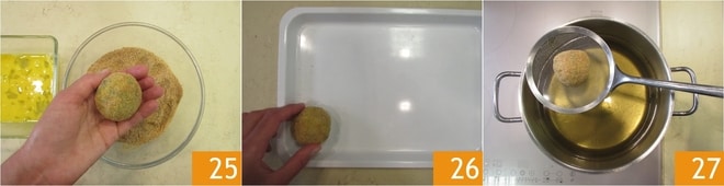 Lorsqu'elle est bien recouverte, passez-la dans la chapelure 25. Procédez de cette manière et transférez les boulettes sur un autre plateau. Faites ensuite frire les boulettes dans beaucoup d'huile d'arachide, préchauffée à 180°, en les plongeant par petites quantités 27.