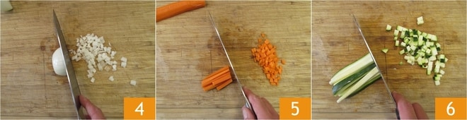 Hachez ensuite l'oignon 4, nettoyez et coupez les carottes en dés de demi-centimètre 5. Faites de même avec les courgettes, en obtenant des cubes de demi-cm 6.