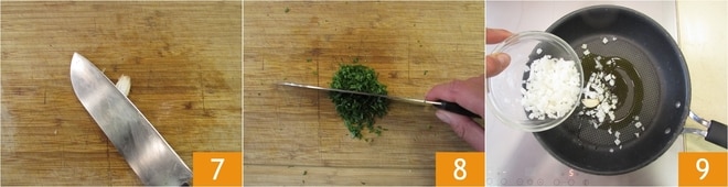 Ecrasez l'ail avec la lame d'un couteau 7 et hachez finement le persil 9. Placez sur le feu une grande poêle, mettez-y l'huile et la gousse d'ail écrasée. Dès que l'huile est parfumée, ajoutez l'oignon haché 9.