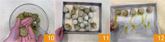 Transférez la pâte dans un bol, prélevez de petites portions et formez les boulettes 10; avec ces doses, vous en obtiendrez environ 20. Passez les boulettes dans la chapelure restante pour bien les enrober 11, puis placez-les sur une plaque recouverte de papier sulfurisé et arrosée d'un filet d'huile 12.