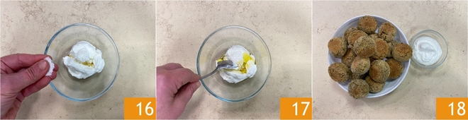 Rectifiez l'assaisonnement en sel 16 et ajoutez un filet d'huile, puis mélangez bien 17 jusqu'à obtenir une crème homogène. Servez les boulettes de lentilles au four chaudes accompagnées de la sauce au yaourt épicée 18 !