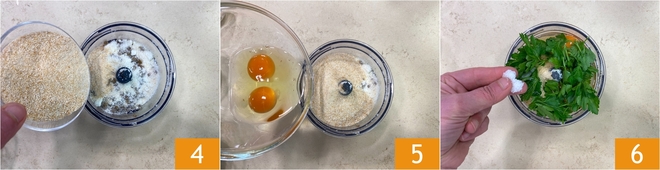 Ajoutez 100 g de chapelure 4 et les œufs 5. Complétez avec le persil, puis assaisonnez de sel et de poivre 6.