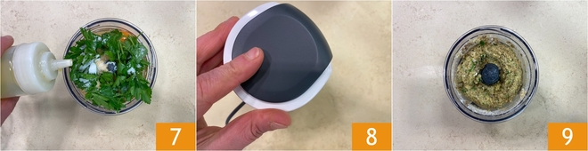 Assaisonnez d'un filet d'huile d'olive extra vierge 7. Fermez le mixeur 8 et mixez jusqu'à obtenir un mélange homogène, mais pas trop fin 9.