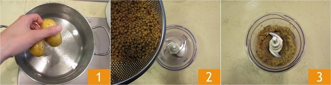 Pour préparer les boulettes de lentilles et pommes de terre à la sauce, commencez par faire bouillir les pommes de terre 1. Il faudra environ 30-40 minutes, en fonction de leur taille. Quand les pommes de terre sont presque cuites, versez les lentilles déjà égouttées dans le bol d'un mixeur 2 et mixez-les jusqu'à obtenir une crème 3.