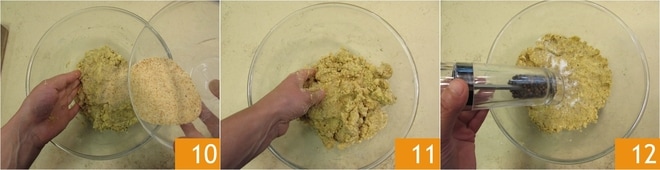 Ajoutez maintenant la chapelure 10 et mélangez 11. À la fin, assaisonnez de sel et de poivre 12.