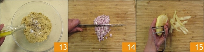 et un filet d'huile 13. Mélangez bien le tout et mettez de côté, pendant ce temps préparez la sauce. Hachez finement l'échalote 14 et épluchez les pommes de terre 15.