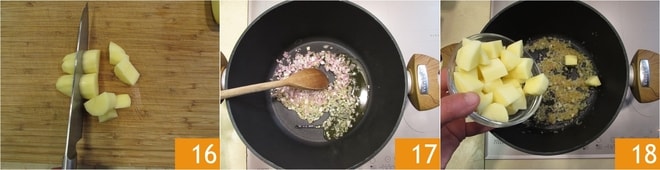 Coupez-les en dés de 2-3 cm 16. Maintenant, versez un filet d'huile dans une poêle et faites revenir l'échalote pendant 7-8 minutes à feu moyen. Quand elle est bien cuite, ajoutez les pommes de terre 18.