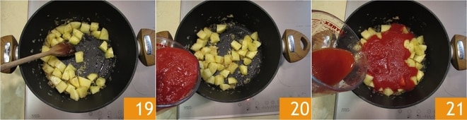 Faites revenir les pommes de terre pendant 2 minutes 19 et versez la purée de tomates 20. Ajoutez ensuite un peu d'eau pour diluer la sauce 21.