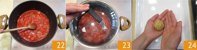 Salez, poivrez et mélangez bien 22. Couvrez avec un couvercle et laissez cuire pendant 40 minutes, en remuant de temps en temps. Pendant ce temps, formez les boulettes en utilisant environ 30 g de pâte et en leur donnant une forme ronde 24.