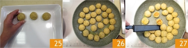 Continuez ainsi jusqu'à ce que toutes soient formées, en les disposant au fur et à mesure sur un plateau 25. Vous en obtiendrez environ 25. Une fois les boulettes prêtes, prenez une poêle antiadhésive, versez un filet d'huile et chauffez-la sur le feu. Placez les boulettes à l'intérieur et faites-les cuire pendant 4-5 minutes. Utilisez une spatule pour les retourner délicatement 27.