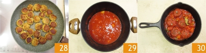 Cuisez encore pendant 5 minutes supplémentaires, jusqu'à ce qu'elles soient bien dorées de chaque côté 28. Dès que la sauce est prête 29, versez-la sur les boulettes et servez 30.