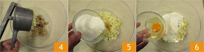 Transférez-les dans un grand bol et quand elles sont cuites, écrasez les pommes de terre à l'intérieur 4. Ajoutez le Grana Padano DOP râpé 5 et l'œuf 6.