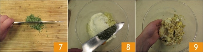 Émincez ensuite le romarin 7 et ajoutez-le dans le bol 8. Mélangez le tout avec les mains 9.