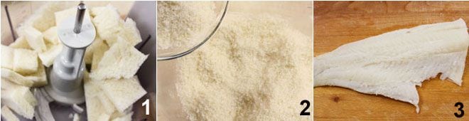 Pour préparer les boulettes de morue, commencez par dessaler la morue en la rinçant bien sous l'eau courante et en la faisant tremper pendant deux jours dans de l'eau froide, en changeant l'eau au moins deux fois par jour. Pendant ce temps, placez dans un mixeur la mie de pain 1, mixez-la finement et mettez-la dans un bol 2. Après les deux jours, séchez bien la morue 3