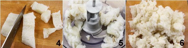 et ensuite coupez-la en morceaux 4. Enlevez les arêtes des filets de cabillaud à l'aide d'une pince et hachez-les finement avec un couteau, ou mettez-les dans le mixeur pendant quelques secondes (5-6).