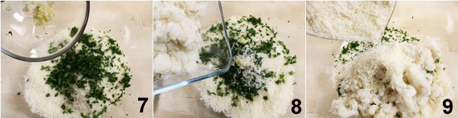 Dans un grand bol, mettez la mie hachée, le persil, le thym, l'ail 7, la morue 8 et enfin le parmesan râpé 9.