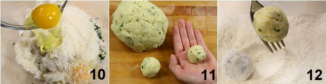 Ajoutez ensuite deux œufs 10 et assaisonnez de sel et de poivre. Mélangez bien pour amalgamer le tout de manière à obtenir un mélange compact. Avec vos mains, formez des petites boules avec la pâte 11 et déposez-les sur un plateau. Préparez trois bols : un pour la farine, un pour la chapelure et un dans lequel mettre un œuf battu. Passez ensuite les boules d'abord dans la farine 12,