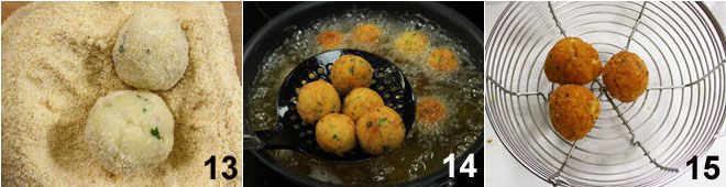 puis dans l'œuf battu et enfin dans la chapelure 13. Faites frire les boulettes dans de l'huile de graines bien chaude 14. Quand les boulettes seront dorées, égouttez-les à l'aide d'une écumoire et posez-les sur du papier absorbant 15 afin qu'elles perdent l'excès d'huile.