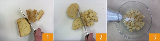 Pour préparer les boulettes de pain à la poêle, coupez le pain en tranches et éliminez la croûte 1, puis réduisez-le en petits morceaux 2. Transférez le pain dans un bol, versez le lait et laissez-le ramollir pendant quelques minutes 3.