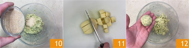 Ajoutez de la chapelure seulement si le mélange est trop mou 10. Mettez de côté la préparation et coupez la fontina en petits cubes 11. Formez maintenant les boulettes en prélevant une partie du mélange 12.
