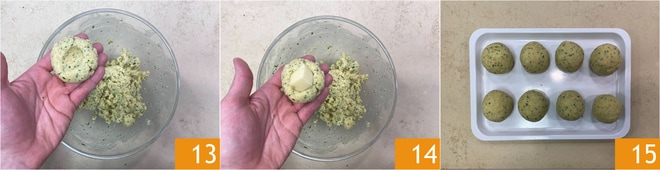 Aplatissez-les au centre 13 et insérez un cube de fontina 14. Continuez jusqu'à ce que la préparation soit épuisée 15.