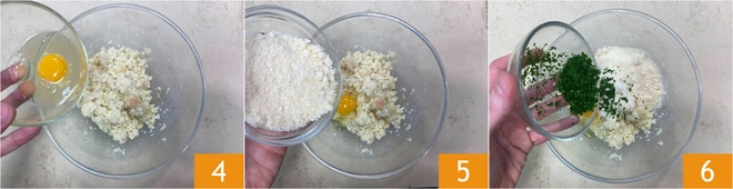 Ajoutez l'œuf 4, le fromage râpé 5 et le persil 6.