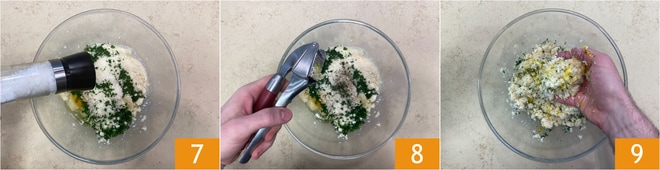 Salez 7, poivrez et assaisonnez avec une gousse d'ail écrasée 8. Pétrissez le mélange avec vos mains 9.