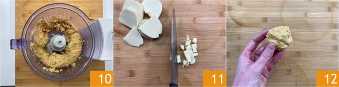Mixez le tout jusqu'à obtenir un mélange lisse et modelable, un peu comme un houmous très dense 10. Coupez le provolone en très petits morceaux 11. Maintenant, formez les boulettes : prélevez 35 g de pâte avec les mains huilées ou humidifiées 12 et écrasez légèrement dans la paume de la main.