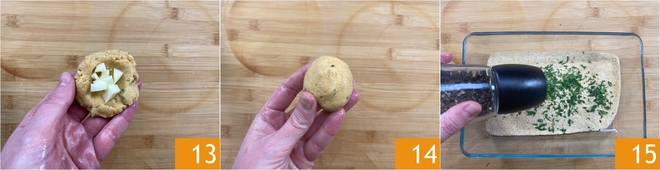 Insérez quelques morceaux de provolone à l'intérieur 13 et refermez pour obtenir une boulette ronde, qui enferme le fromage à l'intérieur 14. Ensuite, dans un plat, versez la chapelure, ajoutez du persil haché supplémentaire et une pincée de poivre 15. Mélangez.