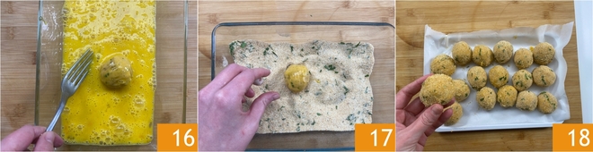 Procédez à la panure. Passez chaque boulette dans l'œuf, battu avec une pincée de sel 16 puis dans la chapelure préparée 17. Au fur et à mesure que les boulettes sont prêtes, disposez-les sur un petit plateau 18.