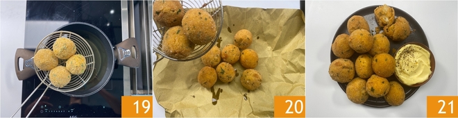 Au moment de la friture, chauffez l'huile à 160-170°C. Dès qu'elle atteint la bonne température, plongez quelques pièces à la fois 19. Faites cuire jusqu'à ce qu'elles soient bien dorées et égouttez-les sur du papier absorbant 20. Salez légèrement et servez vos boulettes de pois chiches avec la sauce que vous préférez 21.