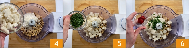 Pour préparer les boulettes de pois chiches, commencez par hacher le persil 1 et réservez-le. Dans le bol du mixeur, versez les pois chiches préalablement rincés et égouttés 2. Ajoutez le Grana râpé 3.