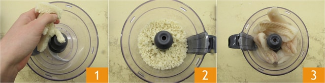 Pour préparer les boulettes de poisson, commencez par mettre dans un mixeur la mie de pain 1, mixez-la finement 2 et mettez-la dans un bol. Retirez les arêtes des filets de cabillaud à l'aide d'une pince à épiler et hachez-les dans le mixeur pendant quelques secondes 3.