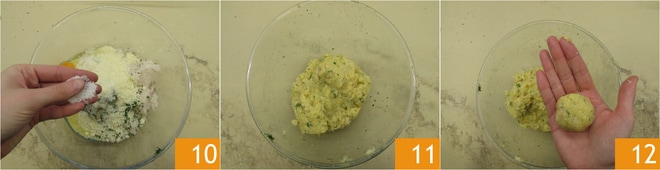Assaisonnez de sel 10 et de poivre. Mélangez bien pour amalgamer le tout 11 et formez avec vos mains des boules de la taille d'une noix d'environ 30 g de pâte 12.