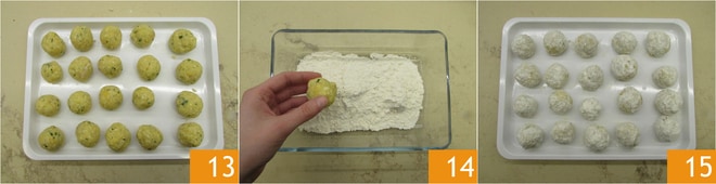 Au fur et à mesure, placez les boulettes sur un plateau, vous en obtiendrez environ 20-25 13. Passez-les ensuite dans la farine 1415.