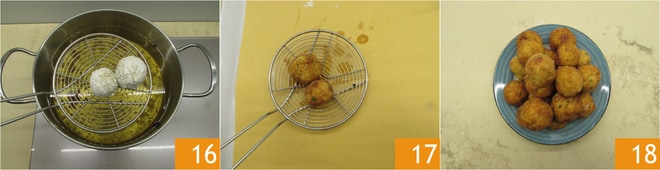 Faites frire les boulettes 2/3 à la fois dans de l'huile de graines bien chaude, à environ 170°, pendant environ 3 minutes. Lorsque les boulettes sont dorées, égouttez-les de l'huile à l'aide d'une écumoire 16 et déposez-les sur du papier absorbant 17 pour éliminer l'excédent d'huile. Dégustez les boulettes de poisson chaudes ou tièdes 18 !