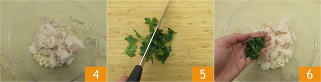 Mélangez dans un bol le cabillaud haché avec le pain 4. Lavez et hachez le persil 5, puis ajoutez-le dans le bol 6 avec le thym.