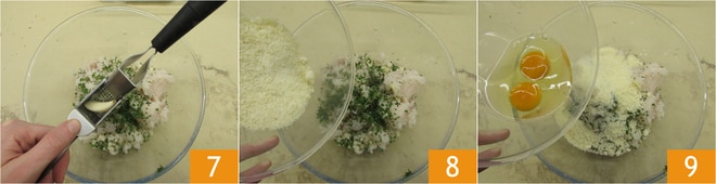 Assaisonnez avec l'ail écrasé 7 et le fromage râpé 8. Incorporez ensuite les deux œufs 9.