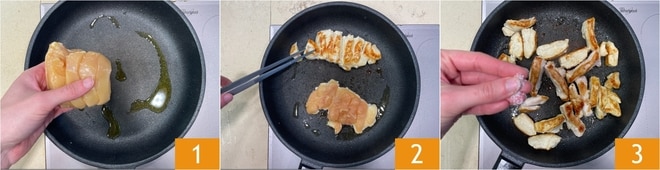 Pour réaliser les boulettes de poulet frites avec caviar et truffe, commencez par la cuisson du poulet : déposez les poitrines de poulet dans une poêle antiadhésive déjà chaude avec un filet d'huile 1. Faites dorer le poulet à feu moyen pendant environ 5 minutes de chaque côté, en le tournant avec des pinces de cuisine 2. Ajoutez une pincée de sel 3.
