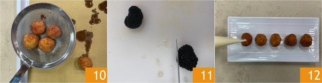 Une fois dorées uniformément, égouttez les boulettes sur du papier absorbant pour friture 10. Pendant ce temps, coupez la truffe en fines tranches 11. Dressez les boulettes de poulet frites en ajoutant un petit point de mayonnaise en dessous de chacune, puis faites la même chose sur le dessus 12.