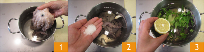 Pour les boulettes de poulpe, commencez par cuire le poulpe (déjà nettoyé) : mettez-le dans une grande casserole en l'immergeant dans de l'eau froide 1, ajoutez-y aussi une petite poignée de gros sel 2, des grains de poivre noir, des gousses d'ail écrasées, une partie du bouquet de persil, le zeste de citron et la moitié de celui-ci 3. Comptez 2 heures à partir du moment où l'eau bout.
