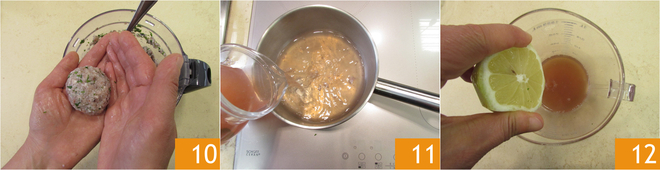De cette préparation, vous pouvez former les boulettes, il en résultera environ 10 à 12 selon la taille 10. Laissez-les raffermir au réfrigérateur environ 15 minutes. En attendant, préparez la mayonnaise : filtrez l'eau de cuisson du poulpe, il en faudra 500 ml. Versez-la dans une petite casserole 11 et réduisez à feu doux jusqu'à ce qu'il reste 100 ml de liquide, puis laissez tiédir. Transférez le concentré d'eau de poulpe dans un récipient haut et pressez le jus de citron, il en faudra environ 1 cuillère à soupe 12.