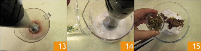 Activez le mixeur plongeant 13 et ajoutez progressivement l'huile de graines tout en continuant à mélanger 14. La mayonnaise obtenue sera lisse et veloutée. Ajoutez les olives et les câpres égouttés et hachés préalablement 15 et mélangez.