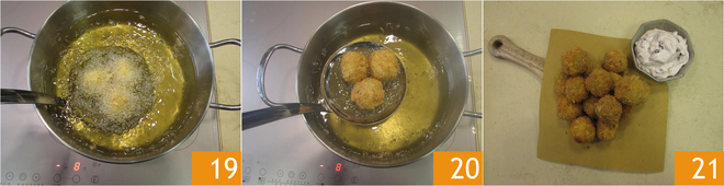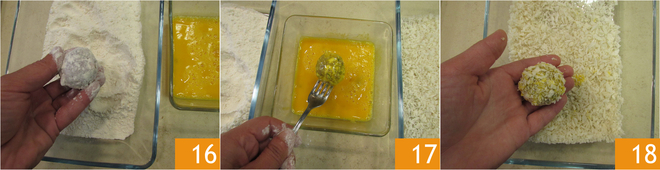 Reprenez les boulettes du réfrigérateur et chauffez l'huile de graines jusqu'à une température de 175 °C. Ensuite, passez-les à la panure des boulettes : passez-les une par une d'abord dans la farine 16, puis dans les œufs battus 17, enfin dans le panko 18.
