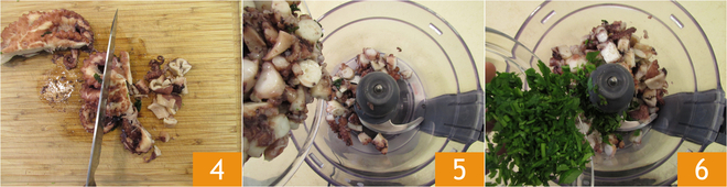 À la fin de la cuisson, le poulpe doit être très tendre, il doit se « désagréger » facilement. Une fois cuit, égouttez-le (en gardant de côté l'eau de cuisson qui servira pour la mayonnaise); puis coupez le poulpe en morceaux encore chaud 4. Versez le tout dans le bol d'un mixeur et ajoutez le persil haché 6.