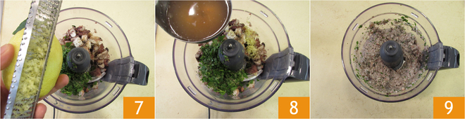 Râpez le zeste de citron 7, salez et poivrez à votre goût, puis versez un peu d'eau de cuisson du poulpe 8. Mixez le tout. Pendant que vous mixez, ajoutez un filet d'huile. Vous devez obtenir à la fin une pâte souple mais compacte 9.