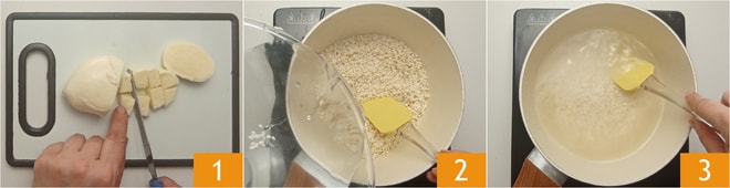 Pour préparer les boulettes de riz, commencez par couper la mozzarella en petits dés 1 et laissez-la égoutter dans une passoire fine pendant 30 minutes. Pendant ce temps, rincez plusieurs fois le riz jusqu'à ce que l'eau soit claire, puis mettez-le dans une casserole et ajoutez de l'eau pour couvrir complètement le riz 2. Cuisez à feu doux, en remuant de temps en temps 3, jusqu'à ce que le riz ait absorbé toute l'eau.